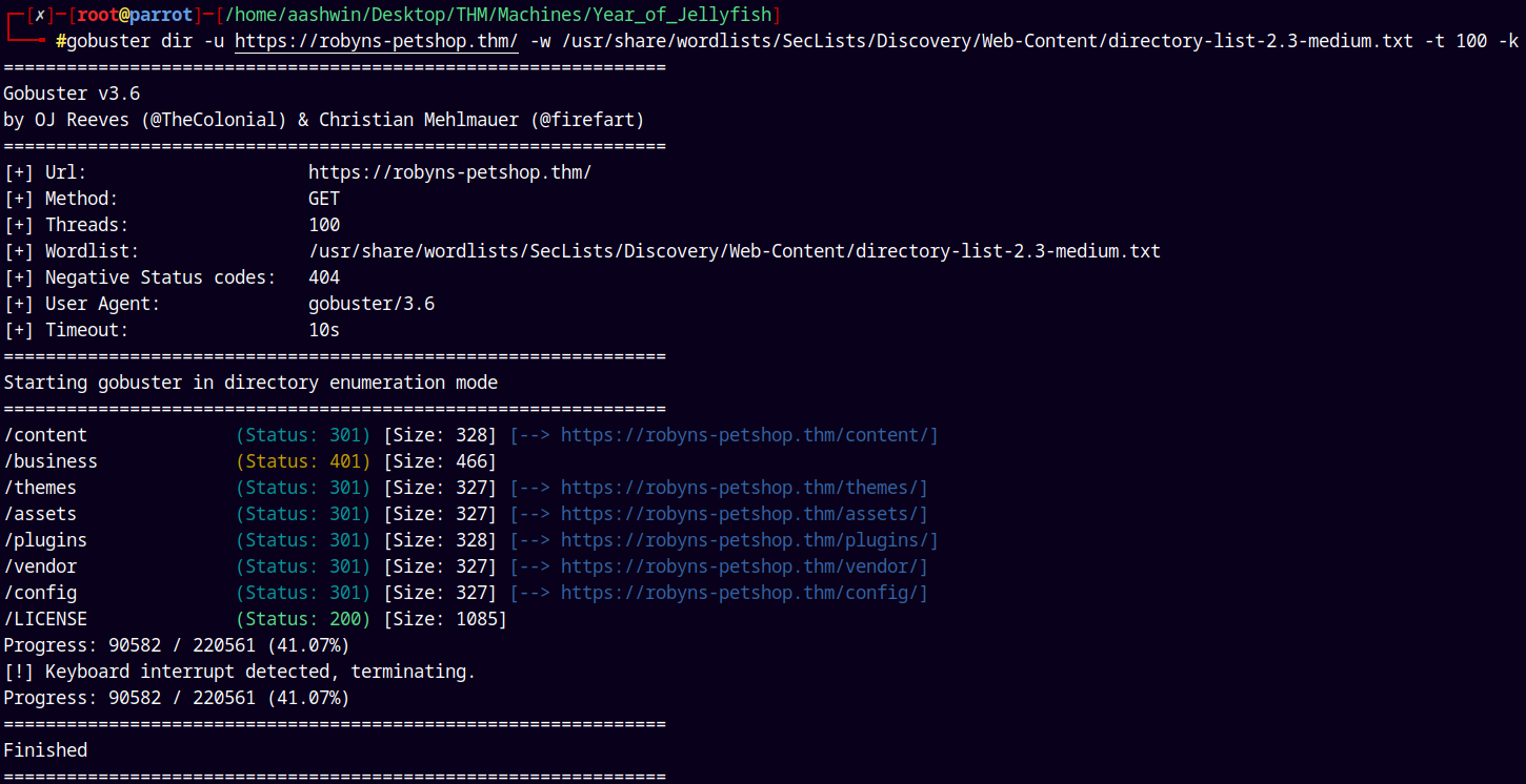 gobuster dir -u https://robyns-petshop.thm/ -w /usr/share/wordlists/SecLists/Discovery/Web-Content/directory-list-2.3-medium.txt -t 100 -k