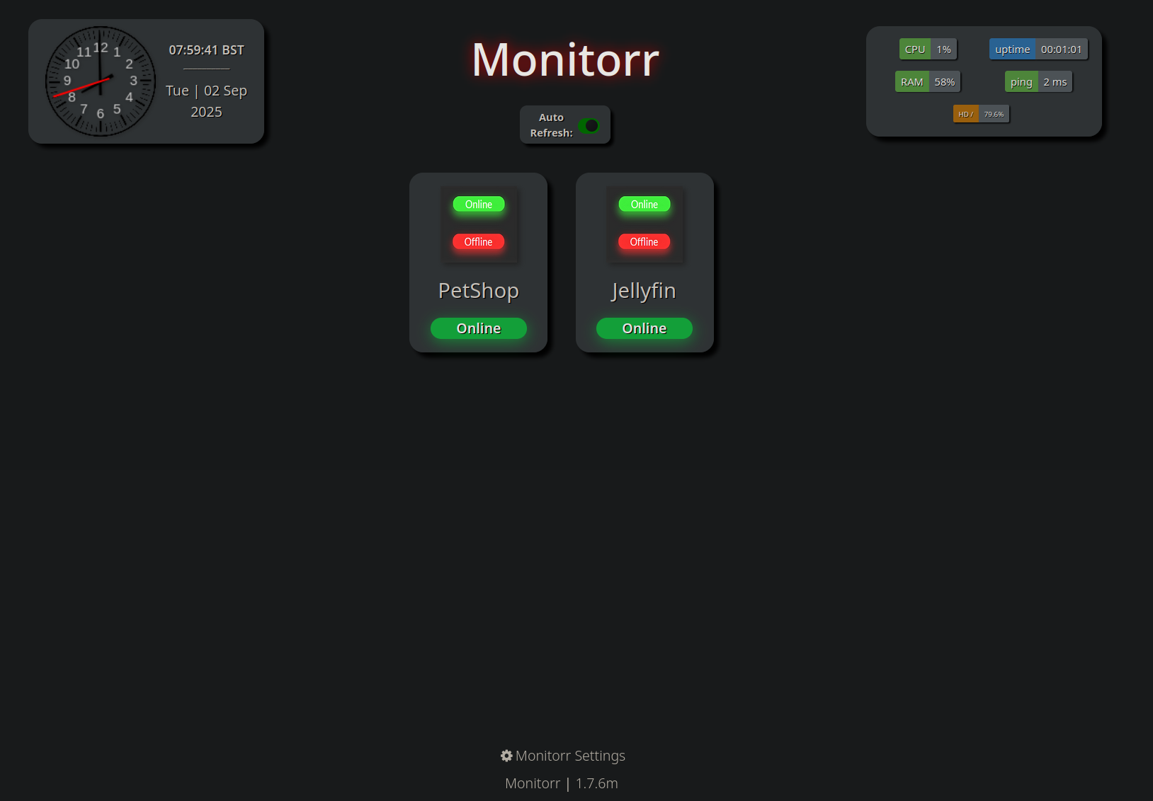 Visiting the monitorr page we have this monitoring portal for the 2 services running on the domain.